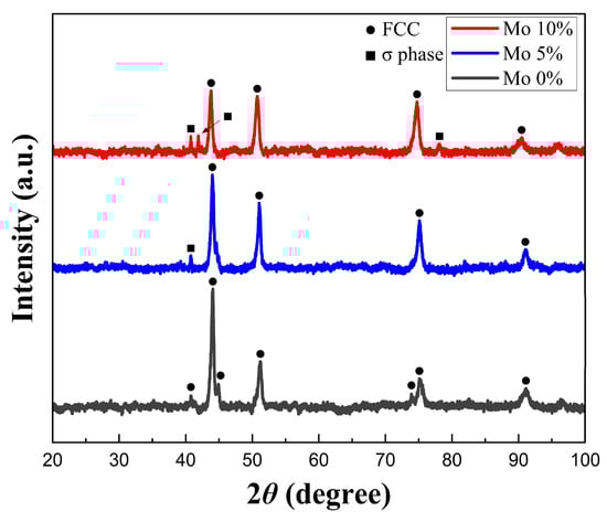 The XRD results of the Cr25-xCo25Ni25Fe25Mox (x = 0, 5, 10) specimen.