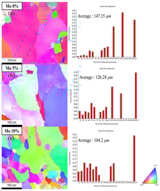 EBSD IPF mapping and grain size of (a) 0%, (b) 5%, and (c) 10% Mo specimen.