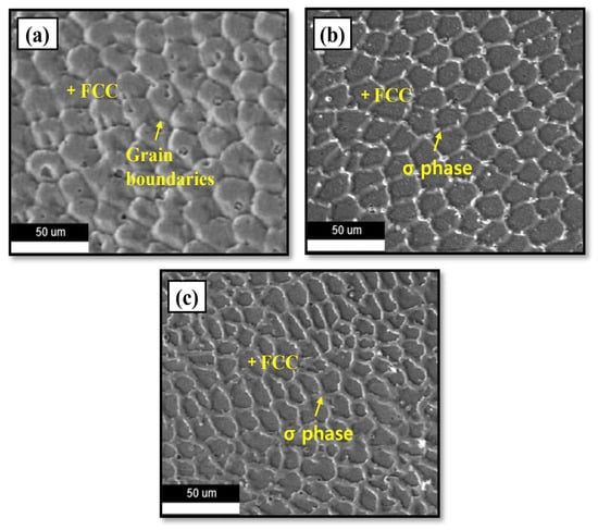 The addition of Mo enhances the chemical interactions and crystal nuclei of the alloy. The inclusion of Mo results in the creation of the σ phase, mainly as a consequence of the interactions between Cr and Mo. The phase development is enabled by the separation of Mo and Cr atoms at the grain boundaries, which serve as active sites for the initiation of the σ phase []. The confirmation of the σ phase is achieved by the conduct of XRD and EDS analyses, as depicted in Figure 7 and Figure 10, correspondingly.