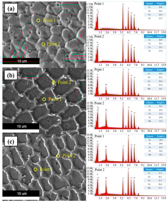 In Figure 10a, the EDS analysis shows that two points within the FCC phase exhibit similar compositions, suggesting a homogeneous distribution within the grain interior of the DED-fabricated high-entropy alloy. Nevertheless, the ratio of Cr to Mo is noticeably higher in Point 1 than in Point 2 when comparing the Point 1 FCC phase and Point 2 σ phase in Figure 10b,c.