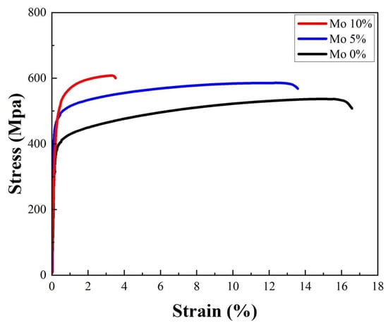 - Using Mo greatly enhanced the mechanical properties of the alloys. The inclusion of Mo facilitated the formation of the σ phase, resulting in an enhanced grain boundary-strengthening effect and improved mechanical strength. The results of the tensile test demonstrated that the inclusion of Mo increased YS and UTS. The YS and UTS of the specimens with 0% Mo were measured to be 388 MPa and 524 MPa, respectively. By including 5% Mo, the YS and UTS experienced significant enhancements, reaching 466 MPa and 574 MPa, respectively. These increases correspond to a 20.1% increase in YS and a 9.5% increase in UTS. By including 10% Mo, the YS and UTS were elevated to 514 MPa and 631 MPa, respectively. This corresponds to 32.5% and 20.4% enhancements compared to the alloy with 0% Mo.