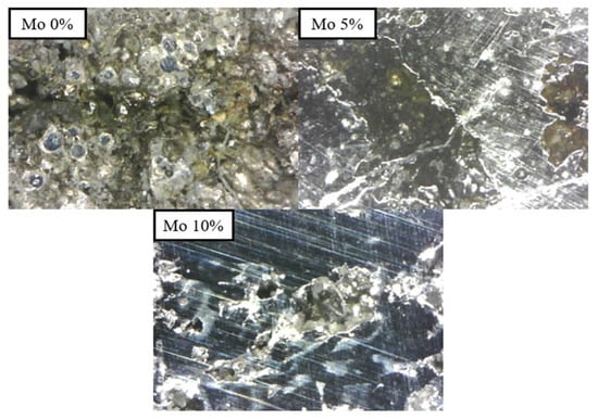 As seen in Figure 12, the SEM image of fracture surfaces from three alloys with different Mo concentrations (0%, 5%, and 10%) offers essential information about the observed elongation behavior during tensile testing. The SEM study shows a notable evolution in fracture properties related to the rise in Mo content. The 0% Mo alloy exhibits a ductile fracture morphology, defined by a relatively smooth surface with dimples. This morphology suggests that the alloy has excellent plasticity and high extendability. As shown by the presence of dimples alongside some sharp fractures, the 5% Mo alloy displays a mixed fracture mode that combines both ductile and brittle characteristics. This shift implies that the incorporation of a moderate quantity of Mo starts to impact the structural integrity of the alloy.