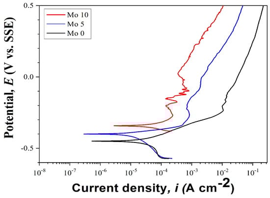 The 5% Mo alloy displayed a higher potential and lower current density than the 0% Mo alloy, suggesting greater resistance to initial corrosion and a slower progression of corrosion. The highest corrosion potential and the lowest current density were observed in the 10% Mo alloy, which subsequently exhibited the highest resistance to initial corrosion and the slowest corrosion progression. Consequently, according to the parameters of that study, an increase in Mo content is associated with a slower progression of corrosion and higher resistance to initial corrosion.