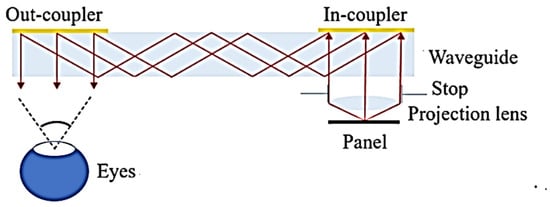 The structure of the projection lens used for the AR glasses is illustrated in Figure 1. The emissive surface of the panel is located at the focal plane of the projection lens. The primary function of the projection lens is to collimate the panel image and project it onto the in-coupler surface. A linear grating used as an input coupler guides the information light into the waveguide under total internal reflection (TIR) conditions. The information light is then guided within the waveguide. Finally, another linear grating acts as the out-coupler, directing the information light to the observer, where the image is subsequently captured by the eyes. In this situation, the final captured image consists of multiple information light beams with varying numbers of TIRs. If the information light provided by the projection lens is not well collimated, this can result in blurry or ghosting images. Therefore, the projection lens is a crucial component in a waveguide AR device. To the human eye, the projection lens structure is a magnifying glass system, and the panel image seen by the human eye will have an angle magnification effect.