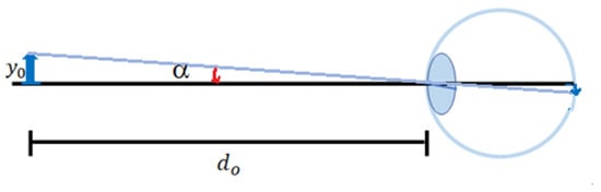 When an object with a height of yo is placed at the distinct vision distance do (do = −250 mm), the angle between the chief ray at the maximum height of the object and the optical axis is α (α < 0), forming an inverted reduced real image on the retina [32], as shown in Figure 2.