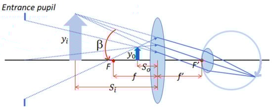 When an object is located at the focal point of a magnifying glass, the image of the object seen by the eyes is at infinity, which is the most comfortable state for the human eye (corrected eye). The relationship between the object height yo, the magnifying glass image focal length f′, and the angle β is shown in Equation (2).