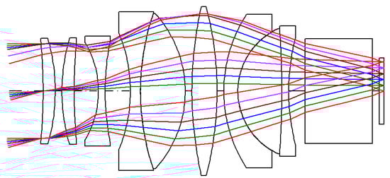 In the research and development of the AR glasses system, which is yet to reach the mass production stage and uses a small number of lenses, in order to reduce the manufacturing cost of lenses, we designed nine spherical lenses and improved the imaging quality of lenses with a set of doublet lenses and a set of achromatic triplet lenses. The lens design results are obtained by Code V software and optimization techniques. The projection lens has an effective focal length of 16.443 mm, and a F-number of 1.1745. The schematic of the designed projection lens structure is shown in Figure 4. The ray tracing of these different colors in the figure represents different field of view angles. To improve waveguide luminous efficiency, the entrance pupil diameter is 14 mm, and the proposed solution uses 9 lens elements to achieve the required optical specification. The projection lens design data are presented in Table 5.