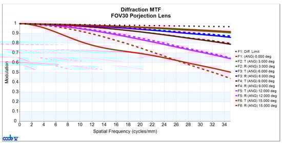 Finally, the spatial frequency was input into the CODE V software for tolerance analysis, and the MTF values with the design tolerances were calculated. As can be seen in Table 10, in the central field of view at a spatial frequency of 57 cycles/mm, with an angular resolution of 33 PPD, the design tolerance MTF is 0.363. For the 0.7 field of view at a spatial frequency of 40.3 cycles/mm, with an angular resolution of 23 PPD, the TAN design tolerance MTF is 0.258, and the RAD design tolerance MTF is 0.179.
