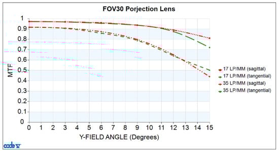 A 0.35-inch liquid crystal on silicon (LCoS) display module manufactured by Himax (Hsinchu, Taiwan) [33] is employed in the design of the 30-degree FOV projection lens. LCoS is a reflective display technology using liquid crystals to manipulate light polarization and generate an image. The specifications of the LCoS display module are listed in Table 1. The panel resolution is 1280 × 720 pixels. The active area of the panel is 7.68 mm × 4.32 mm. One half of its diagonal length is the imaging height h of the projection lens; that is, h = 4.406 mm.