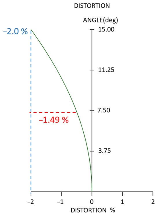 We present the lens design values for optical distortion and TV distortion. Figure 7 presents the optical distortion, the horizontal axis representing the percentage of optical distortion, and the vertical axis representing the half-field angle in degrees. The blue dashed line indicates optical distortion values with an absolute value of less than 2%, while the red dashed line represents the TV distortion. The TV distortion [35] is the absolute difference between the maximum and minimum optical distortion values from 0.49-field to 1.0-field and has a value of 1.49%.