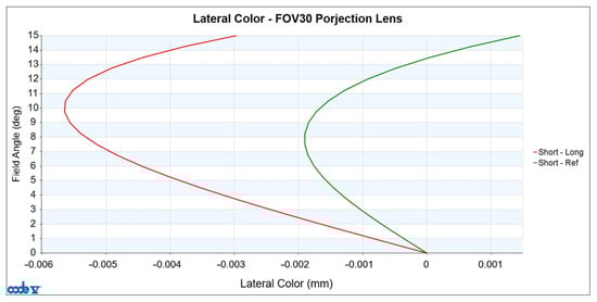 The design values for lateral color are illustrated in Figure 8. The horizontal axis represents the differences in real image height caused by different wavelengths, measured in millimeters, while the vertical axis represents the half-field angle in degrees. The red curve shows the difference in real image height between the short wavelengths and the long wavelengths, and the green curve shows the difference in real image height between the short wavelengths and the reference wavelength. The projection lens is designed to ensure that the lateral color on the sensor is less than the size of one pixel (6 μm). This is necessary to prevent color shifts on the sensor and avoid image blurring. In this design, at 0.65 field, the maximum lateral color value, which is the difference in real image height between the short wavelengths and the long wavelengths, has an absolute value of 5.565 μm.