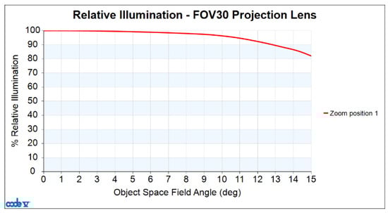 Finally, the values for relative illumination obtained with this design are depicted in Figure 9. The horizontal axis represents the half-field angle in degrees, and the vertical axis represents the percentage of relative illumination. The red curve illustrates the ratio of edge illuminance to central illuminance at a different half-fields angle. For this design, the relative illumination is still greater than 82.05% at the maximum half-field angle.