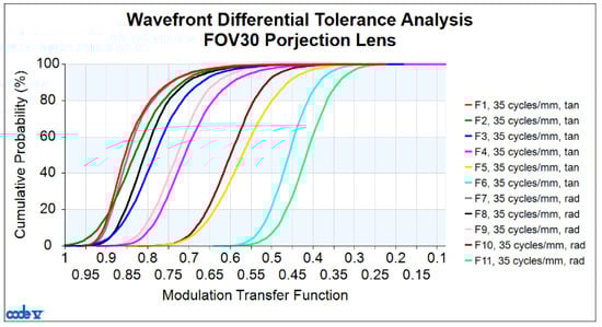 Finally, a comprehensive analysis incorporating all tolerance factors was carried out with the results presented in the form of a tolerance analysis curve, as shown in Figure 10. The cumulative probability is plotted on the vertical axis, while the design plus tolerance MTF is plotted on the horizontal axis. Here, TAN represents the tangential direction, and RAD represents the radial direction. For a lens manufacturing yield of 97.7%, the minimum design plus tolerance MTF for 1.0 field RAD is 0.296.