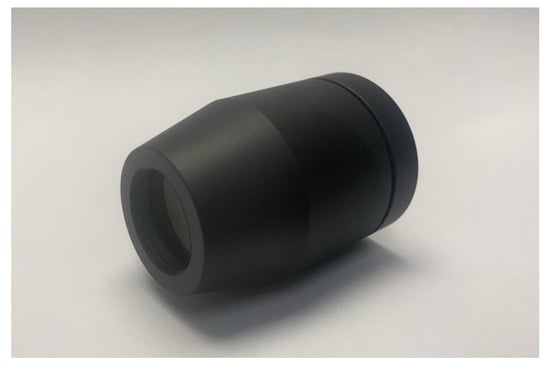 The tolerance compensation parameter DLZ employed to adjust the optimal imaging plane position for the best image quality has a value of 0.247 mm. The design + tolerance MTF at the 1.0 field for the radial direction reaches a minimum value of 0.296. Figure 11 shows a photo of the finished 30-degree FOV projection lens.
