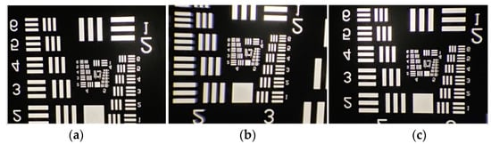 The inverse projection testing method used for testing the lens involves placing the USAF resolution test chart on the image plane. Since the image is upside down and reverse left to right, and the effective area of the sensor is 7.68 mm × 4.32 mm, the observation range can only reach the Group 2 series and above at most, as shown in Figure 13. Figure 13a shows an image of the test chart with the center point of the test chart located at the center point of the image plane. In Figure 13b, the center point of the test chart on the image plane is shifted to the left by 3.08 mm (4.406 mm × 0.7), which indicates a field displacement of −0.7. Figure 13c shows an image in which the center point of the test chart on the image plane on the image plane is shifted 3.08 mm (4.406 mm × 0.7) to the right, a field displacement of +0.7.