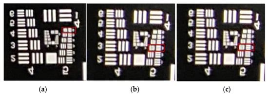 Image quality testing using the resolution test chart: (a) central field of view; (b) 0.7 field of view on the left side (−0.7 field); and (c) 0.7 field of view on the right side (+0.7 field).