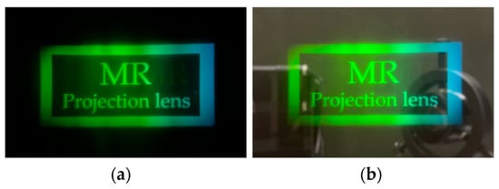 The image production performance of the projection lens was assessed. A VHOE-based exit pupil expander was integrated within the AR display system, as shown in Figure 15. The front-lit LCoS panel (7028FL, Himax, Hsinchu, Taiwan) was arranged at the projection lens’ object focal plane. A waveguide was utilized to guide the light information into the observer’s eye. The waveguide couplers were both VHOEs, and the structure of the out-coupler was comprised of a volume grating that is symmetrical to the in-coupler.