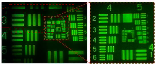 We can observe the image shown in Figure 16. Figure 16a shows the resulting image in a dark room; the measured FOV is 26.29 degrees. Figure 16b shows the observed image in a bright room aligns with the estimation. The image projection and the environment scene can be observed simultaneously. In our case, the in-coupler and out-coupler are VHOEs designed for green light. Consequently, the resulting image appears green since the Bragg selectivity when the front-lit LCoS panel provides a white image. Finally, the LCoS panel was replaced with a 1951 USAF resolution chart to determine the image quality. This resulting image, shown in Figure 17, Element 6 from Group 5, is visible. This shows that we can achieve an image quality of as high as 57 cycles/mm and 33 PPD.
