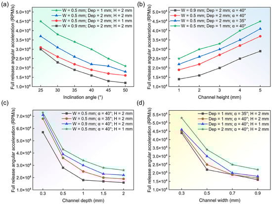 Study of the geometric parameters of the connecting channel. (a) The relationship between the inclination angle of the connecting channel and the angular acceleration upon complete release. (b) The relationship between the height of the connecting channel and the angular acceleration upon complete release. (c) Trends in full release angular acceleration for different depths of the connecting channel. (d) Trends in full release angular acceleration for different widths of the connecting channel.