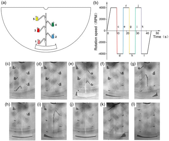 Schematic diagram of controlled sequential release. (a) Design drawings of five Euler-force-driven valve sequential release configurations. (b) Plot of speed versus time during sequential release. Within the ±4000 RPM rotation speed range, the running angular accelerations are 20,000, 35,000, 50,000, 95,000, and 100,000 RPM/s from left to right. (c–l) Physical images corresponding to (b) during sequential release.
