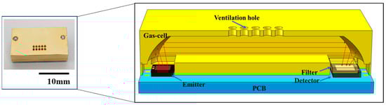 The design of a CO2 sensor with the potential to be integrated into a potable gas analyzer is presented here. The NDIR gas sensor was composed of key components, including a MEMS infrared emitter, a gas chamber, a thermopile detector, and a filter with a central wavelength of 4.26 µm (Full Width at Half Maximum (FWHM) = 0.09 µm). The main parameters of the thermopile detector in this manuscript were as follows: the resistance was 71 kΩ, the sensitivity was 45 V/W, the noise voltage was 47.2 nV/√Hz, and the response time was 15 ms. In our design, the MEMS emitter was a blackbody radiation emitter with a central sensitive area of 1.2 mm × 1.2 mm, maintaining a modulation depth of 100% within 20 Hz []. The overall dimensions were 1.8 mm × 1.8 mm × 0.4 mm, with a central radiation area of 1 mm × 1 mm. In this work, both the MEMS emitter and detector were bare chips within the sensor, as shown in Figure 1. Compared to traditional NDIR gas sensors, which integrate pre-packaged chips, this approach significantly reduces the sensor’s size. The overall dimensions of the sensor were 20 mm × 10 mm × 4 mm. For comparison, the size of a traditional NDIR sensor, such as the CUBIC NDIR CO2 gas sensor, is 33 mm × 19 mm × 9.4 mm [], which represents the standard size for conventional NDIR gas sensors. The sensor developed in this work was only 15% of the traditional sensor’s size.