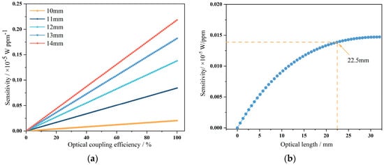(a) The impact of coupling efficiency on sensitivity at different optical path lengths. (b) The variation in sensitivity with optical path length.
