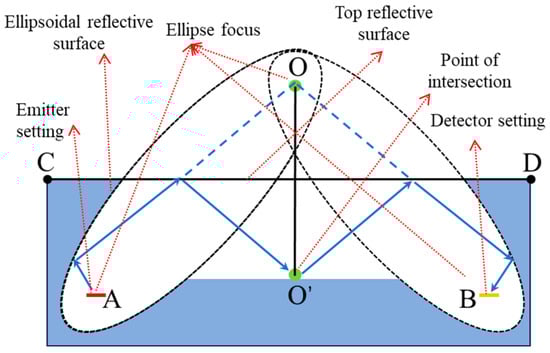 To improve the sensor’s sensitivity, it is necessary to achieve an optical path length of no less than 22.5 mm while maximizing coupling efficiency. Given the MEMS infrared light source’s divergence angle of ±45°, a specially designed structure must be used as a reflector to shape the light propagation and improve the detector’s optical coupling efficiency. An innovative dual-ellipsoid mirror optical system was designed and the specific light path is shown in Figure 3. The gas chamber was composed of three parts: the top surface, the bottom surface, and the ellipsoidal reflective surface. The light emitted from the light source illuminates the ellipsoidal surface, reflects onto the bottom surface of the gas chamber, and then converges at the detector through the ellipsoidal surface above the detector. The light absorbed by the detector in the gas chamber space mainly comes from the reflected light of the ellipsoidal surface, which has already been reflected 3–5 times, thereby increasing the optical path length. In this design, the emitter and detector of the sensor are located at the focal points A and B of the ellipses. O’ is the symmetric point of the ellipse’s focal point O. CD is the perpendicular bisector of OO’.