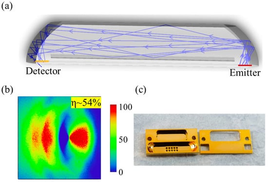 The optical coupling efficiency of this design was substantially improved, being about 5–8 times greater than that of conventional NDIR gas sensors, which usually have optical coupling efficiencies between 5% and 10% [], as illustrated in Figure 4c. To minimize light reflection losses during the reflection process, the surface of the gas cell was polished and coated with a 200 nm thin layer of gold []. This can reduce surface roughness and improve reflectivity in the mid-infrared range [,]. According to research, this combination of polishing and gold coating has achieved a reflectivity of over 95% []. In addition, gold also has good chemical stability, which can enhance the stability and reliability of the sensor. The dimensions of the gas cell were 20 × 10 × 3 mm3.