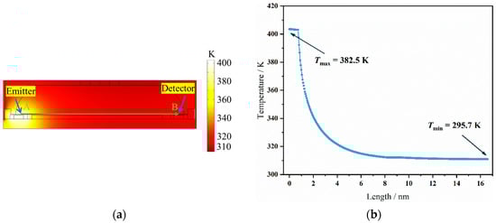 (a) The temperature distribution of the sensors using the FEM. (b) The temperature curve from the emitter to the detector.