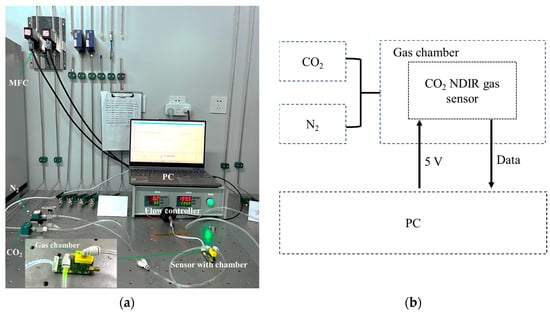 To evaluate the sensor’s ability to monitor CO2 concentration, the prototype of the miniature NDIR CO2 gas sensor was tested and assessed. This involved accurately controlling the gas concentration within a predetermined measurement range to precisely evaluate the measurement accuracy of the prototype at specific concentration points. The setup for testing the gas sensor is shown in Figure 7. The gas is controlled using two mass flow controllers (MFCs, model: Xinnovis MFC-T), each connected to two gas cylinders: one containing 99.99% pure N2 gas and the other containing 10% standard CO2 gas. The sensor testing apparatus included a sensor test gas chamber, the gas sensor, and the associated circuitry. Data collection and storage were managed via computer software on an upper-level machine.