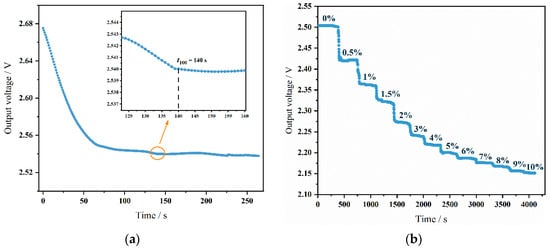 Based on the constructed gas sensor testing system, the sensor’s performance was evaluated. Different volumes of N2 and CO2 were controlled using flow controllers to achieve CO2 concentrations ranging from 0% to 10%. Testing different CO2 concentrations assessed the sensor’s response. Across the whole experiment, the gas flow was maintained at a constant rate of 100 sccm. The initial power-on time of the sensor was tested first to evaluate the time required for the sensor to reach optimal operational status after startup. Testing in a pure N2 environment yielded results, as shown in Figure 8a. The sensor reached a stable output state 140 s after powering on, indicating a total response time (t100) of 140 s. Through these tests, the sensor’s response characteristics at different time points were clearly understood, which is crucial for optimizing startup time in practical applications and improving system response efficiency. Additionally, knowing the sensor’s response time under specific conditions helps in designing control systems and setting alarm thresholds to ensure safety and reliability under various operational conditions.