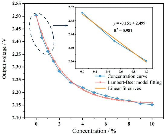 The sensitivity of the sensor can be determined by the concentration value and the change in signal response. Multiple measurements of the sensor signal at each concentration point yield the concentration change curve of the sensor, as shown in Figure 9. The slope of the curve represents the sensitivity of the sensor at different concentrations. From the graph, it can be observed that as the concentration increases, the sensitivity of the sensor gradually decreases, which conforms to Lambert–Beer’s law. However, at low concentrations, the concentration change is linear, indicating approximate linearity of sensitivity. From the analysis of the inset in Figure 8, within the concentration range of 0 to 1%, the linear regression function is y = −0.15x + 2.499, with a goodness of fit (R2) of 0.981, indicating good linearity of concentration change from 0 to 1%. Therefore, its slope represents the sensor’s sensitivity, which is 15 μV/ppm in the sensitivity range of 0 to 1%. Compared to previous work [], although the size slightly increased, the sensitivity improved nearly threefold.