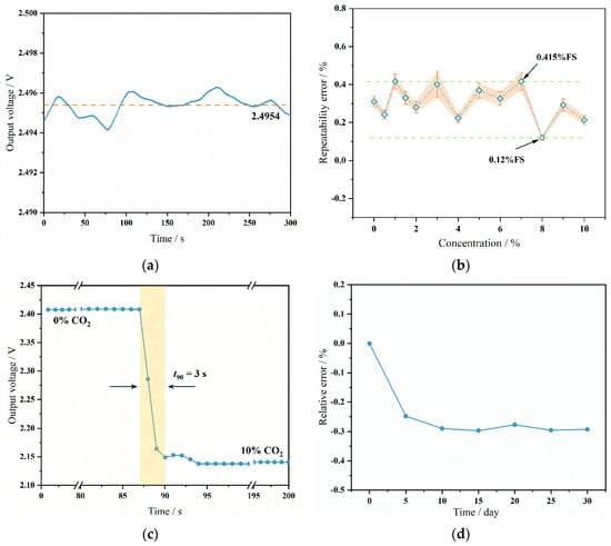 The sensor’s response to different concentrations was tested. CO2 gas concentrations were divided into 0%, 0.5%, 1%, 1.5%, 2%, 3%, 4%, 5%, 6%, 7%, 8%, 9%, and 10%, comprising 13 concentration points. Each concentration point was maintained for 5 min after stabilization. Sensor response was assessed by monitoring voltage changes at varying CO2 gas concentrations. The sensor’s dynamic response at different concentrations is depicted in Figure 8b. The tests indicate that the sensor effectively distinguishes between all 13 concentration points. Benefiting from the optimized chamber design and circuitry, the sensor shows a strong response at low concentrations. Optimizing the chamber design to extend the optical path can significantly enhance sensor sensitivity at lower concentrations. However, this may reduce resolution at higher concentrations.