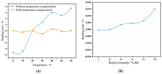 The sensor was placed in a constant temperature and humidity chamber to simulate the effects of environmental temperature and humidity changes on the sensor by adjusting different temperatures and humidity levels. The temperature in the chamber was programmed to vary from 0 °C to 60 °C in 10 °C increments. Once the temperature reached the set point and stabilized for half an hour, the sensor signal at the same concentration was collected. The output signal at 20 °C was chosen as the reference point to analyze the signal deviation at different temperatures. The results are shown as the black curve in Figure 11a. At a low temperature of 0 °C, the sensor error was −3.5%, whereas at a high temperature of 60 °C, the error was 4%. This indicates that the sensor’s measurement error reached several thousand ppm, significantly impacting the accuracy of the sensor’s measurements. Therefore, temperature compensation is necessary to bring the sensor’s measurement error back within the normal range. The same temperature compensation algorithm as described in Chapter 3 was applied, establishing a temperature–output relationship model. Signals at different concentrations were tested within the 0–60 °C range, using the signal at 20 °C as the lookup reference. The obtained output signals were used to establish the following function model: