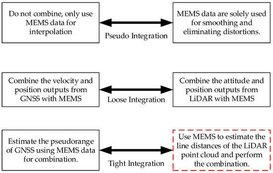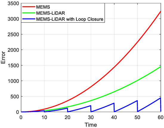 However, MEMS-IMUs are not without limitations. The inherent drift and bias within MEMS-IMU measurements, stemming from sensor imperfections and environmental variations, result in significant time-accumulated deviations in position and orientation estimates [3]. This cumulative error poses a substantial challenge for long-term navigation accuracy, as illustrated by the red line in Figure 1. To mitigate this challenge, Simultaneous Localization and Mapping (SLAM) technology has been introduced, incorporating exteroceptive sensors like cameras and Light Detection and Ranging (LiDAR) [4]. LiDAR has gained prominence due to its ability to provide accurate depth information, even in adverse weather conditions and low-light scenarios. This robustness makes LiDAR a more robust and versatile solution for augmenting IMU data and achieving accurate and reliable localization and mapping in challenging urban environments [5,6].