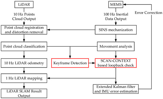 Figure 2 illustrates the overall workflow of the proposed algorithm. The core components, namely keyframe detection and loop closure extraction, are highlighted in a red rectangular box. The keyframe detection process analyzes data from both LiDAR and MEMS sensors, while the extraction and verification of loop closure information are detailed in Section 2.4. This dual-sensor approach presents a comprehensive understanding of the environment and vehicular motion, leading to the intelligent and efficient selection of keyframes for loop closure detection.
