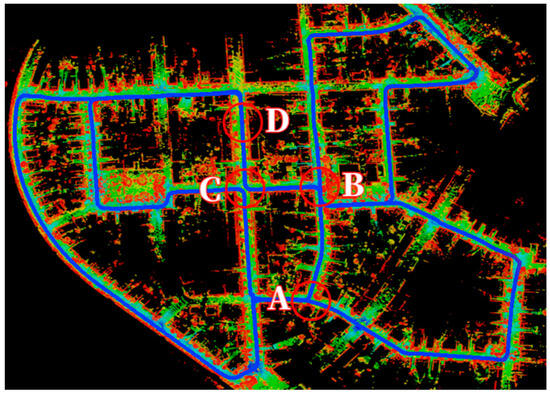 As mentioned in the introduction, one effective way to reduce the computational burden of LiDAR loop closure detection is to minimize the number of loop closure candidate frames. This necessitates a more intelligent approach to determining when keyframes should be stored and compared. Figure 3, sourced from the dataset 00 of the KITTI open-source dataset, depicts four typical scenarios encountered by a vehicle during navigation in a typical urban environment. In scenario A, the vehicle approaches a three-way intersection. In scenario B, the vehicle undergoes a significant change in direction. Scenario C presents a four-way intersection. Finally, scenario D illustrates the vehicle traveling along a straight, unidirectional road.
