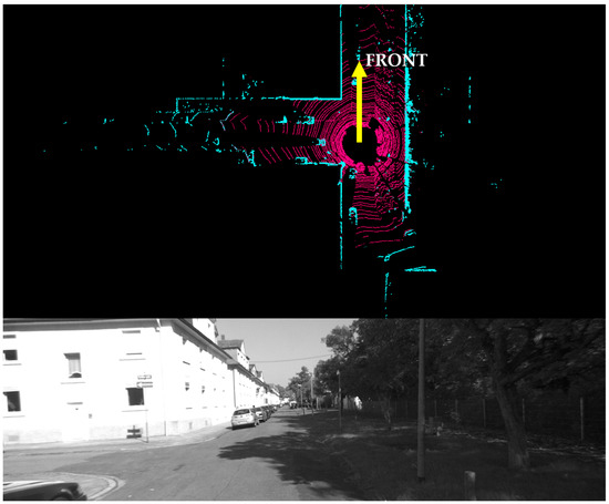 As illustrated in Figure 4, which shows the LiDAR point cloud and the left camera image corresponding to scenario B of Figure 3, the pink lines represent the navigable ground plane, while the cyan areas depict non-navigable obstacles. The yellow arrow indicates the X-axis of the LiDAR scan, which is forward, and the tail end of the arrow is the center of the LiDAR point cloud. To distinguish between these two conditions, point cloud segmentation is employed. This process involves classifying each point in the point cloud as either belonging to the ground or an obstacle, effectively creating a map of the navigable space. Therefore, the proposed algorithm can identify multi-path scenarios by analyzing the segmented point cloud, which is characterized by branching paths or intersections, and it can prioritize them for keyframe selection.