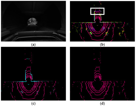 Figure 6 illustrates a scenario where a vehicle navigates through a passage between buildings. Figure 6a shows the front view captured by the camera, while Figure 6b depicts the complete point cloud scan from the LiDAR. The vehicle is passing through an area with overhead occlusion, highlighted as the white-marked region in Figure 6b. A simple bird’s-eye view projection and analysis of this data can easily misinterpret the scene as a single or dual-lane straight passage. Figure 6c presents the point cloud after filtering and removing distractions like pedestrians, while Figure 6d shows the extracted ground points using the method described in Section 2.2.1. Figure 6c clearly reveals a three-way intersection, indicating the need to record a keyframe for loop closure detection. However, the scene might be mistakenly categorized as a specific type without loop closure preprocessing.