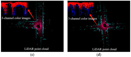 In this Section, the heights of the extracted point clouds are uniformly set to 0 for compression. Then, follow the convention where each horizontal axis represents 3 degrees and each vertical axis represents 0.5 m. For the bins within, a counting method is used to determine the characteristics: if there are no ground points or obstacles in the bin, it is recorded as 0. When the number of ground points is greater than the obstacle points, it is recorded as 1. If there are fewer obstacle points than ground points, it is recorded as 2. Thereafter, the point cloud within a range of 35 m can be compressed into a 120 × 70 two-dimensional array. To visualize the compressed point cloud data in Figure 7, this paper utilizes a three-color representation of the arrays. Data points marked as ‘0’ are represented by black pixels in the image, red pixels correspond to data points marked as ‘1’, and blue pixels represent data points marked as ‘2’. The resulting visualization is displayed in the top-left Section of the four subfigures in Figure 7.