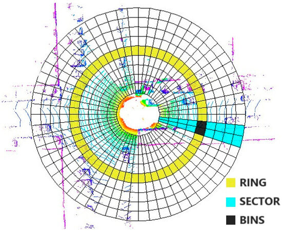 Figure 7 displays the distribution of point clouds in four different scenarios; to further determine the characteristics, it is necessary to process the point cloud with SCAN CONTEXT treatment. Figure 8 shows the bin division along azimuthal and radial directions with the top view of a point cloud from a 3D scan. The ground areas are split in the azimuthal (from 0 to 2π within a LiDAR frame) and radial (from the center to maximum sensing range) directions. They refer to the yellow area as a ring, the cyan area as a sector, and the black-filled area as a bin [15].
