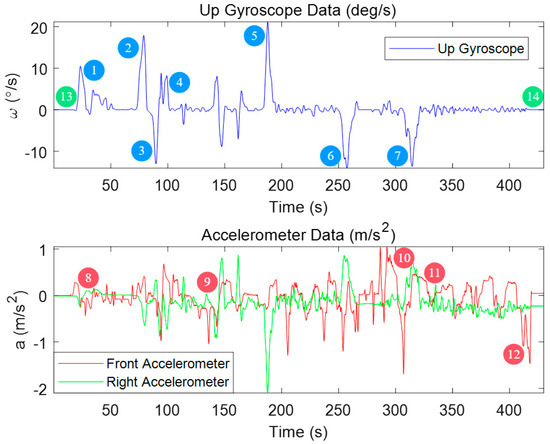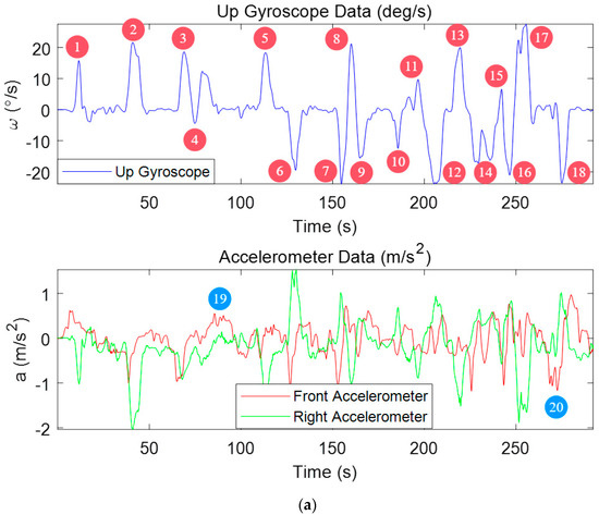 Figure 10 illustrates the variations in gyroscope and accelerometer readings during an experiment. As indicated by the color-coded annotations, the red square boxes highlight periods where the vehicle is stationary, the black rectangular boxes represent instances of turning maneuvers, and the blue rectangular boxes correspond to sudden changes in velocity.