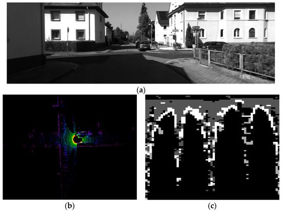 Camera Images, LiDAR Point Cloud and Re-Encoding Result of the Cross Road. (a) View of Crossroad from Camera. (b) LiDAR Point Cloud of Cross. (c) Encoding Result of LiDAR Point Cloud.