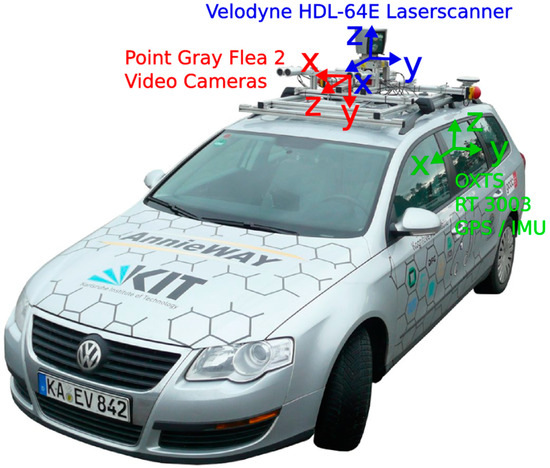 The KITTI Vision Benchmark Suite [25] is a renowned dataset widely used in computer vision and robotics research, particularly for tasks related to autonomous driving. Captured using a sensor suite mounted on a moving vehicle, it comprises a rich variety of real-world driving scenarios across different environments, weather conditions, and traffic situations. As shown in Figure 15 [26], the dataset provides synchronized data from various sensors, including high-resolution color and grayscale cameras, a Velodyne LiDAR scanner, and a precise GPS/IMU localization system. KITTI’s diverse modalities and accurate ground-truth annotations for tasks like object detection, tracking, semantic segmentation, optical flow, and visual odometry have made it an invaluable resource for developing and evaluating algorithms in applications like self-driving cars, mobile robotics, and 3D scene understanding.
