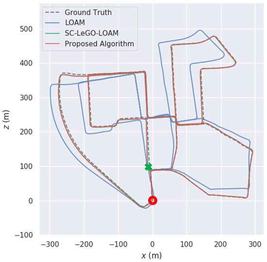As illustrated in Figure 17, the vehicle starts from the red circle point and ultimately returns to the green cross section, having traveled a total of 3724.19 m and experienced 8 loops. A comprehensive comparison with other state-of-the-art methods showcases the performance of the proposed algorithm. It achieves near-identical accuracy to SC-LeGO-LOAM, significantly outperforming methods with no loop closure strategies, such as LOAM. Furthermore, across all 8 loop closure opportunities present in this dataset, the proposed algorithm achieves a 100% identification rate. This highlights its ability to reduce computational burden associated with loop closure without compromising accuracy.