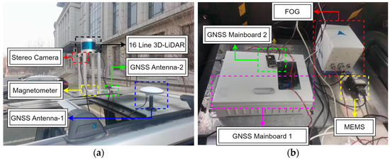 Experimental Hardware. (a) 3D LiDAR and GNSS Antenna. (b) GNSS Processing, Fiber Optic Gyroscope, and MEMS.