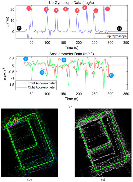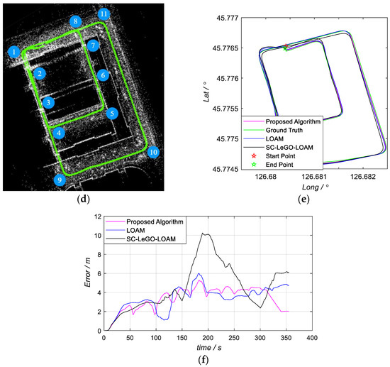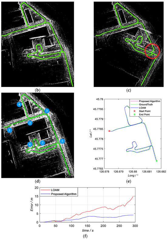 Data_1 was collected at 6 PM on 4 April 2023, near Building 61 of Harbin Engineering University, with a total travel distance of 1460 m. In this scenario, the SUV’s circles around the building for two laps, and the main purpose of the scene setup is to verify the effectiveness of the algorithm in the paper under general environmental conditions. Table 5 presents a performance comparison of different SLAM algorithms under this set of data. The trajectory map can be seen in Figure 19, while the MEMS data in Figure 19a show that it has 14 potential loop closure locations. The LiDAR point cloud in Figure 19d records 11 potential loop closure locations. In the actual experimental process, LiDAR loop closure points 1, 2, 3, 4, 5, 6, 7, and 8 complete actual loop closures, and MEMS loop closure points 13 and 14, as well as 1 and 5 (corresponding to LiDAR loop closure location 1), achieve actual loop closures. Ignoring the repeated paths, the actual loop closure locations in this experiment total 3, corresponding to LiDAR loop closure points 1, 2, and 5, and achieving a 100% recall rate in the experiment. In the initial 1000 m, SC-LeGO-LOAM maintains relatively good performance. However, after the final incorrect loop closure, the total distance is re-optimized, leading to significant misalignment between the final distance and the azimuth angle. The method presented in this paper performs similarly to LOAM in the early stages, but because the original LOAM lacks loop closure detection functionality, its errors are bound to increase over time.
