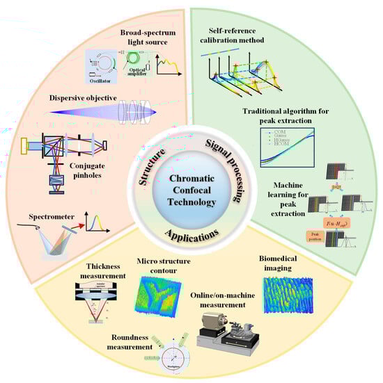 This paper presents an overview of high-precision chromatic confocal sensing technology, as Figure 1 shows. It begins by introducing the main design principles and the structural components, such as the broad-spectrum light source, dispersion objectives, conjugate pinholes, and spectrometer. Then, the signal processing algorithms are described with the use of the self-reference calibration method, along with the traditional algorithm and the machine learning algorithm that are used for peak extraction. Furthermore, this paper explores various applications of chromatic confocal sensing technology, including thickness measurement, microstructure contour measurement, biomedical imaging, online or on-machine measurement, etc. Finally, this paper presents several challenges with measurement and a few potential directions to be explored and researched in the rapidly developing manufacturing industry.
