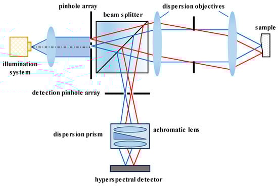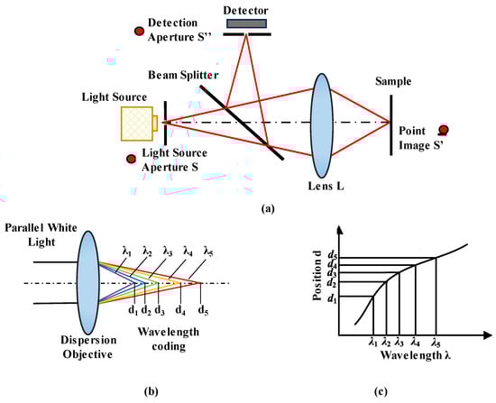Chromatic confocal technology is similar to confocal microscopy. Confocal microscopy dates back to the 1940s and was developed by researchers such as Marvin Minsky []. To date, it has developed rapidly, giving birth to some significant branches, such as laser confocal microscopy and chromatic confocal technology. Laser confocal microscopy uses a monochromatic light source to form a single focus and thus achieve maximum light intensity during the axial scan, corresponding with the focus position. In contrast, chromatic confocal technology uses a broad light spectrum to form a series of foci, corresponding with different wavelengths. The imaging principle of chromatic confocal systems is illustrated in Figure 2. The broadband light source provides light through the first pinhole to allow the lens to focus on the sample, and the reflected light enters the detector through the detection aperture. Based on the optical principle, the light source aperture, the point image and the detection aperture conjugate with each other, as shown in Figure 2a. According to the dispersion phenomenon, different wavelengths of light will be focused on different axial positions by the ordinary lens because of different refractive indexes. Figure 2b shows the one-to-one relationship between wavelength λ and position d. By analyzing the wavelength of the light reflected from the sample surface, its position can be determined from the wavelength–position response curve shown in Figure 2c, which is calibrated before the measurement.