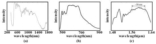 Early chromatic confocal technology used ordinary white light sources, such as tungsten halogen lamps, xenon lamps, white light emitting diodes (LEDs), etc. The white light intensity of the tungsten halogen or xenon lamp varies greatly in the visible band, resulting in large difficulties in signal processing over the full wavelength range. Further, their warm-up time is usually long, and their lifetime is short, meaning they are not suitable for most industry situations. White LEDs are widely used in chromatic confocal sensors, with the advantages of an appropriate spectral range (380~760 nm) and high light efficiency [,,]. In addition, the super-continuum light source can also provide a broad spectrum based on nonlinear modulation. It has become a popular light source for use in chromatic confocal technology research because of its high brightness and high stability, and it is of great importance when seeking to reduce noise interference []. In Figure 3a, we see how K Shi et al. [] obtained a super-continuum spectral light source (350~1750 nm) using a photonic crystal fiber (PCF) to enhance the efficiency and signal-to-noise ratio of the chromatic confocal sensor. In Figure 3b, it can be observed that U Minoni et al. [] used a super-continuum spectral light source (488~1064 nm) produced by a micro-structured fiber (MOF) for the displacement measurement, with a 0.36% repeatability. H Liu and H Matsukuma et al. [,] utilized a similar super-continuum spectral light source (400~2400 nm) for their chromatic confocal imaging research. Beyond this, other researchers [,] have used mode-locked femtosecond lasers to achieve a high wavelength resolution between 1.46 and approximately 1.64 μm, as shown in Figure 3c.